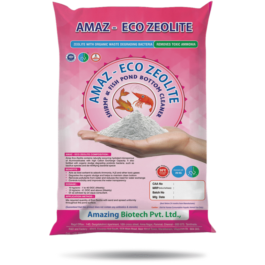 Amaz Eco Zeolite contains naturally occurring hydrated microporous of Aluminosilicates with high cation exchange capacity. It also fortified with organic sludge degrading probiotic bacteria such as Bacillus subtilis, B. cereus, B. pumilus and de-nitrifying bacterial species – Nitrosomonas, Nitrobacter, Nitrococcus.