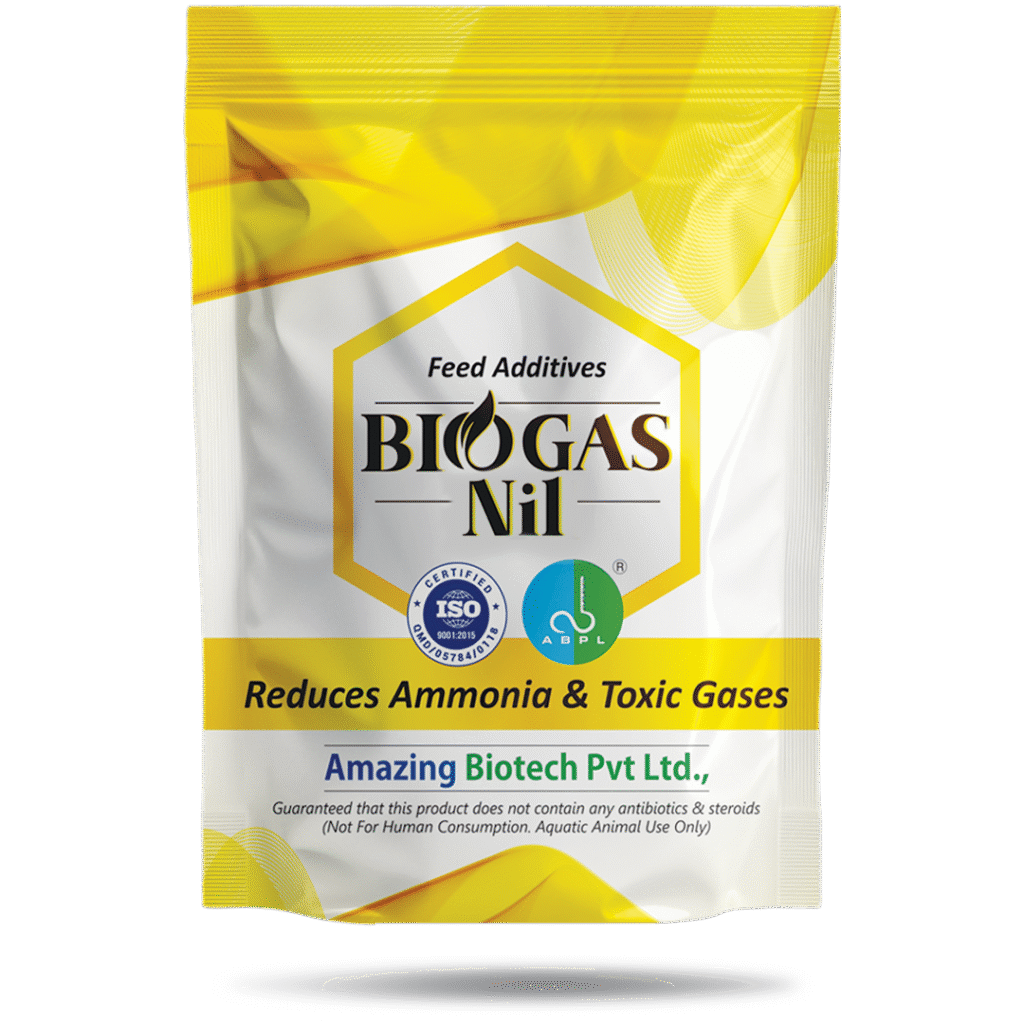 BIO GAS NIL contains highly concentrated Yucca schidigera extract (Saponin 35%) – 60%, Bacillus spp, Nitrosomonas spp, Nitrobacter spp, Thiobacillus spp, Pseudomonas spp., with a total strength of minimum of 8 billion CFU/gram (all probiotic strains) – 30%, and enzymes like Amylase (5000 IU ), Cellulase (5000 IU) – 10%.