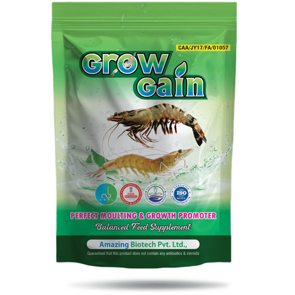 Grow Gain is a natural, non-toxic feed supplement with enriched nucleotides, yeast extract (Saccharomyces cerevisiae), algal protein extracts such as Arthrospira platensis, A. fusiformis, and A. maxima, probiotics such as Bacillus licheniformis, B. pumlius, B. subtilis, B. cereus, and Lactobacillus acidophilus enzymes like amylase-5000 IU, lipase-5000 IU, protease-5000 IU, cellulase-5000 IU and papain, vitamins like Vit C, minerals such as zinc, selenium, calcium and magnesium, amino acids like alanine, tyrosine, leucine and threonine. Grow gain is a perfect balanced feed supplement for growth and moulting.