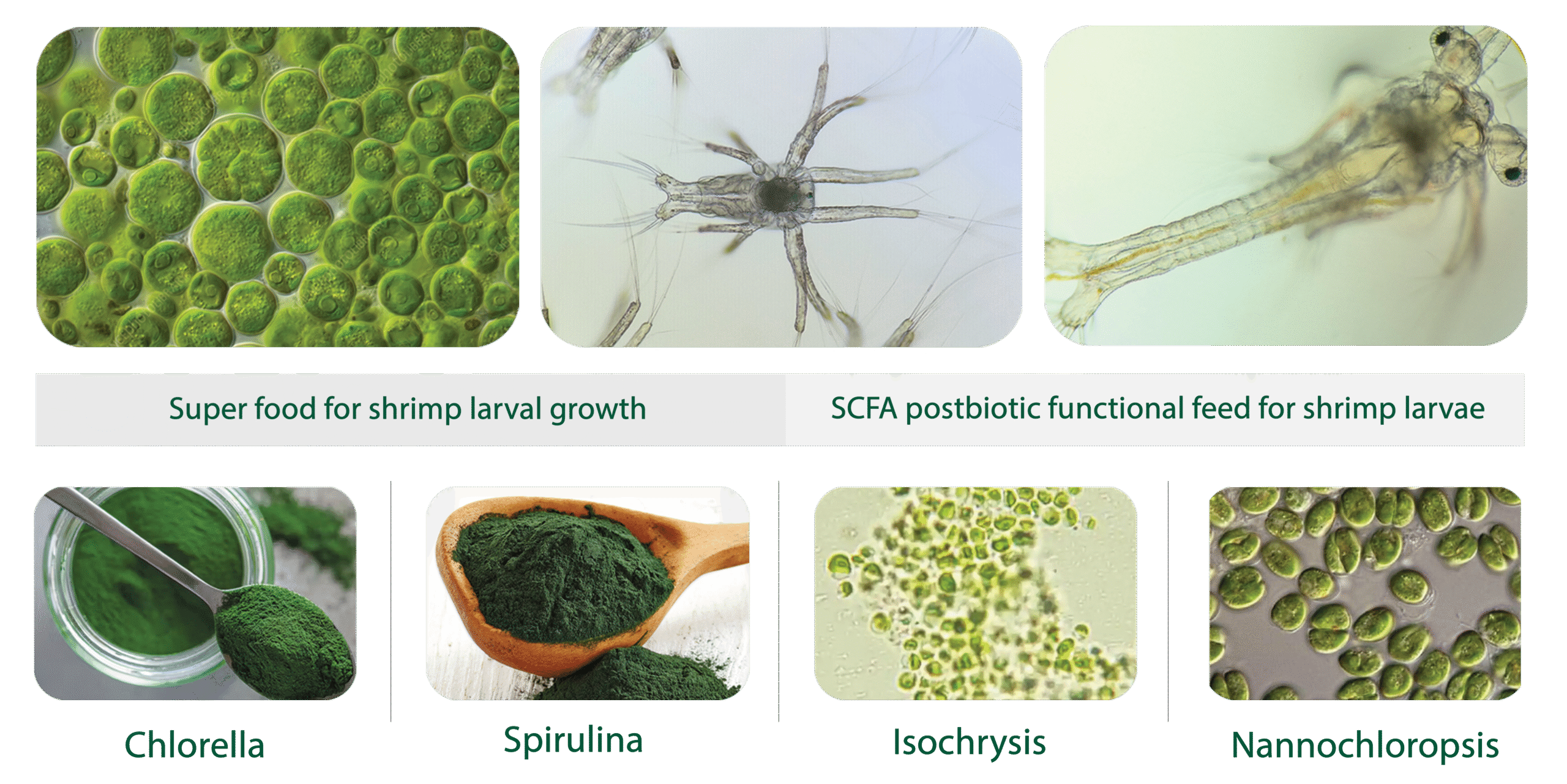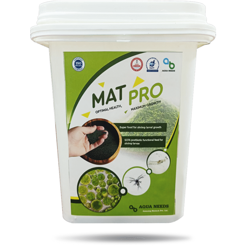 MAT pro consists of micro-encapsulated algae such as Chlorella vulgaris (15%), Spirulina plantensis (50%), Isochrysis galbana (14%), Nanochloropsis spp. (10%) with postbiotics (1%) such as polyhydroxybutyrate and lipopeptide. MAT pro developed by a pioneering microalgae technology (MAT) with micro-encapsulation of algae for specific particle sizes suited for the shrimp hatchery and nursery feeding program